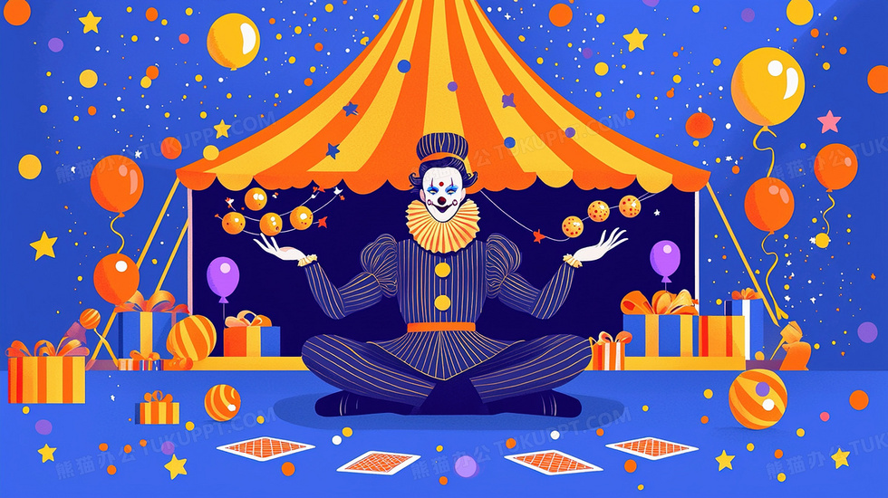 本作品内容为卡通小丑舞台表演才艺插画, 格式为 jpg, 大小3 MB, 图片尺寸为2912 x 1632, 源文件无水印, 欢迎使用熊猫办公。 如认为平台内容涉嫌侵权,可通过邮件:tousu@tukuppt.com提出书面通知,我们将及时处理。