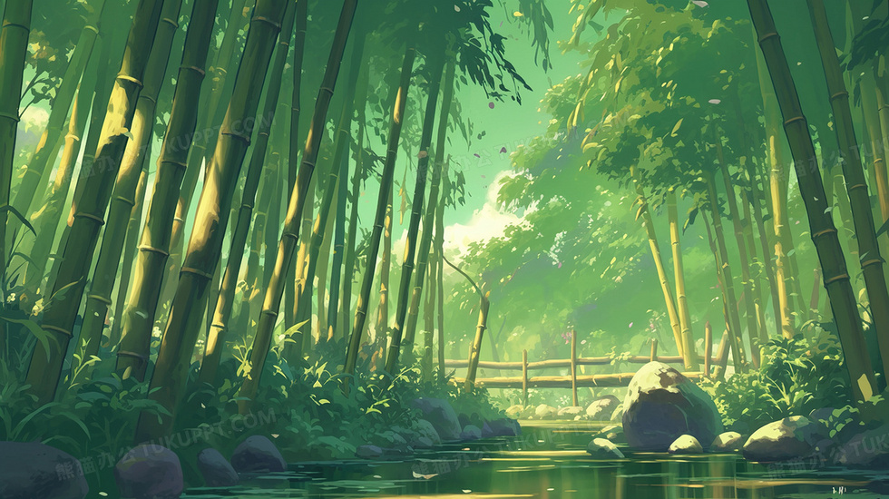 本作品内容为唯美春天风景翠绿竹林插画, 格式为 jpg, 大小3 MB, 图片尺寸为2912 x 1632, 源文件无水印, 欢迎使用熊猫办公。 如认为平台内容涉嫌侵权,可通过邮件:tousu@tukuppt.com提出书面通知,我们将及时处理。