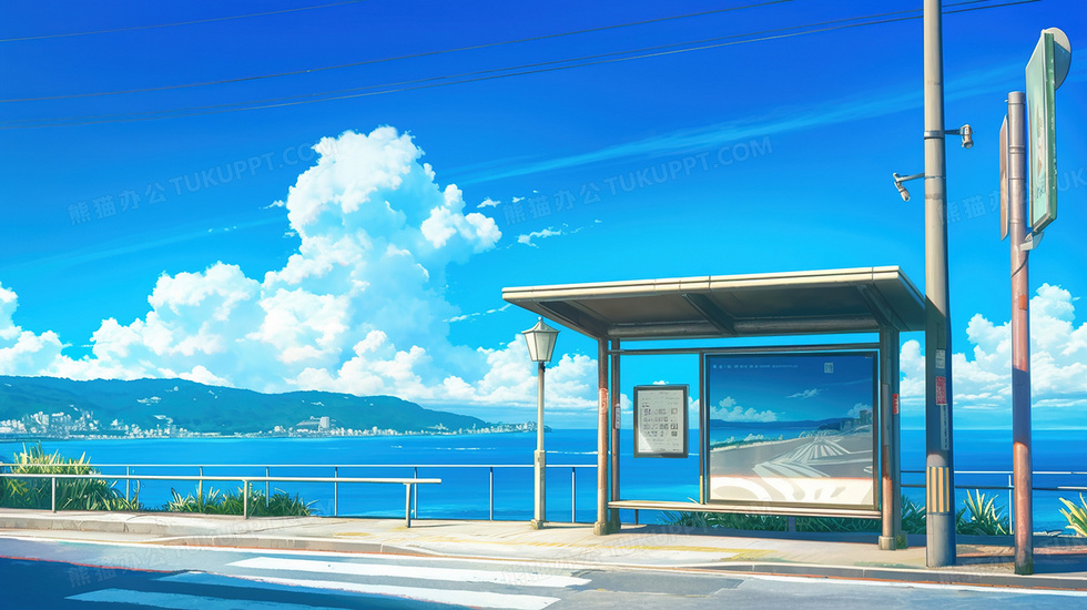 本作品内容为唯美蔚蓝天空海边公交站牌插画, 格式为 jpg, 大小3 MB, 图片尺寸为2912 x 1632, 源文件无水印, 欢迎使用熊猫办公。 如认为平台内容涉嫌侵权,可通过邮件:tousu@tukuppt.com提出书面通知,我们将及时处理。