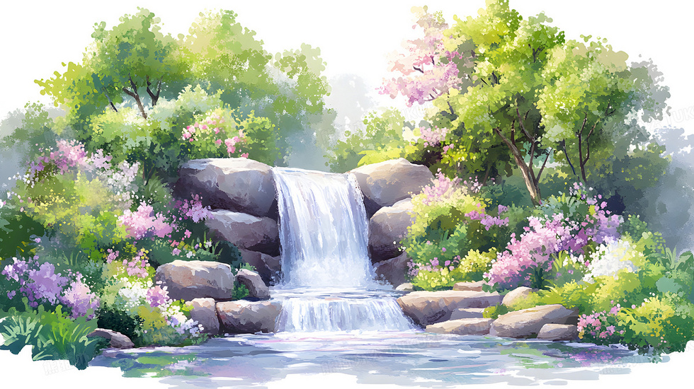 首页 > 插画 > 科技艺术 > 水彩手绘 > 卡通风格春天河流风景瀑布湖水插画
