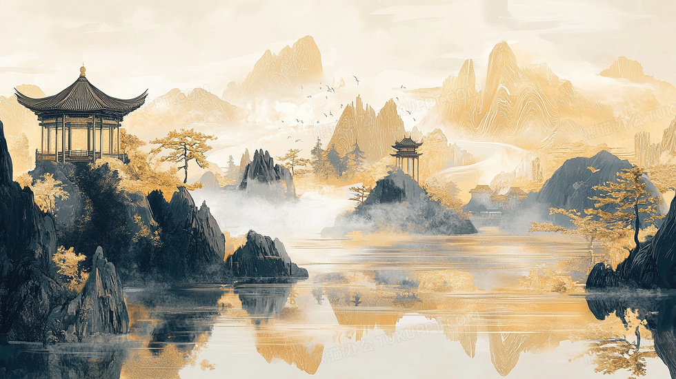 首页 > 插画 > 科技艺术 > 国潮风 > 水墨鎏金烫金中国风山水插画