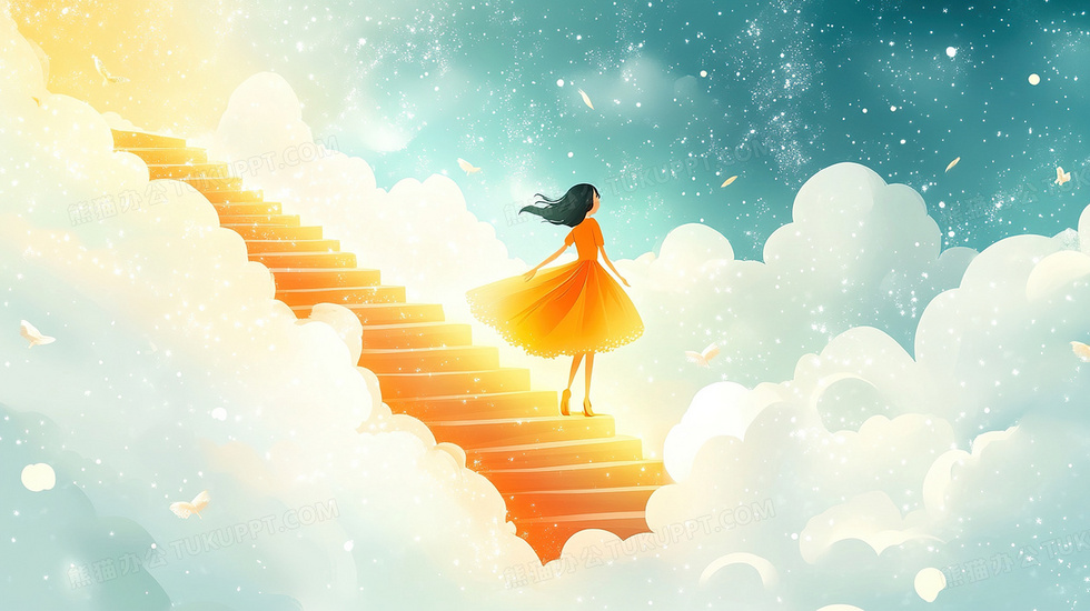 本作品内容为云端走在台阶上的女孩唯美壁纸插画, 格式为 jpg, 大小3 MB, 图片尺寸为2912 x 1632, 源文件无水印, 欢迎使用熊猫办公。 如认为平台内容涉嫌侵权,可通过邮件:tousu@tukuppt.com提出书面通知,我们将及时处理。