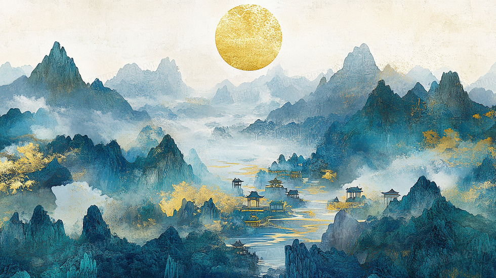 首页 > 插画 > 科技艺术 > 国潮风 > 水墨鎏金烫金中国风山水插画