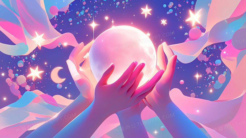 本作品内容为粉色梦幻双手捧着月亮唯美治愈插画, 格式为 jpg, 大小3 MB, 图片尺寸为2912 x 1632, 源文件无水印, 欢迎使用熊猫办公。 如认为平台内容涉嫌侵权,可通过邮件:tousu@tukuppt.com提出书面通知,我们将及时处理。