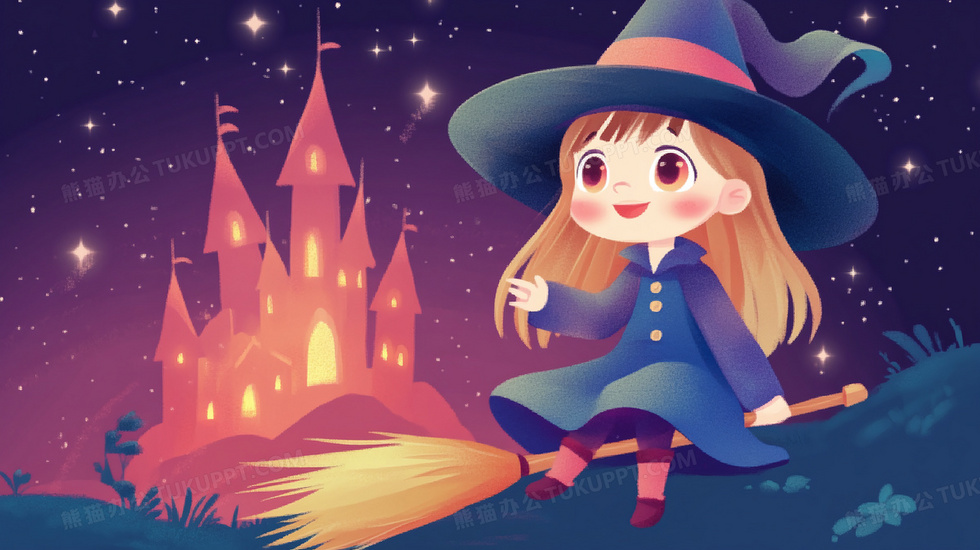 本作品内容为卡通骑扫帚的魔女插画, 格式为 jpg, 大小5 MB, 图片尺寸为2912 x 1632, 源文件无水印, 欢迎使用熊猫办公。 如认为平台内容涉嫌侵权,可通过邮件:tousu@tukuppt.com提出书面通知,我们将及时处理。