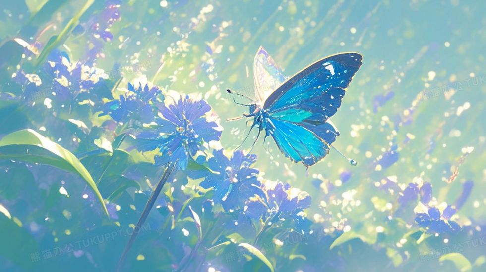 本作品内容为蓝色的蝴蝶在花丛间飞舞插画, 格式为 jpg, 大小1 MB, 图片尺寸为2285 x 1281, 源文件无水印, 欢迎使用熊猫办公。 如认为平台内容涉嫌侵权,可通过邮件:tousu@tukuppt.com提出书面通知,我们将及时处理。