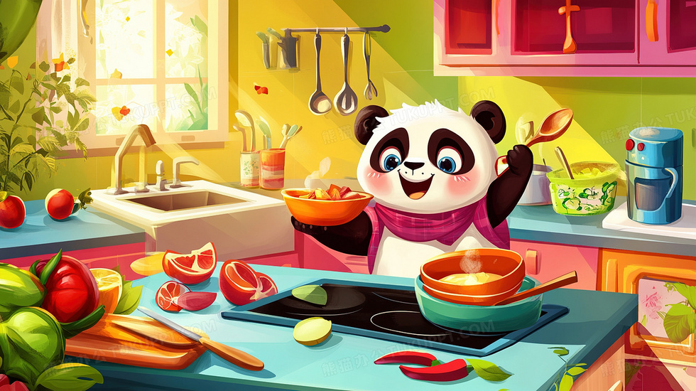 本作品内容为厨房里做菜的可爱卡通熊猫厨师插画, 格式为 jpg, 大小3 MB, 图片尺寸为2912 x 1632, 源文件无水印, 欢迎使用熊猫办公。 如认为平台内容涉嫌侵权,可通过邮件:tousu@tukuppt.com提出书面通知,我们将及时处理。