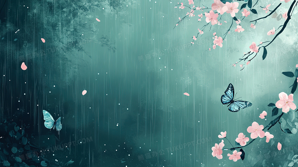 本作品内容为雨中蝴蝶与花背景, 格式为 jpg, 大小3 MB, 图片尺寸为2912 x 1632, 作品中背景图片无需修改, 源文件无水印,可以直接使用, 欢迎使用熊猫办公。 如认为平台内容涉嫌侵权,可通过邮件:tousu@tukuppt.com提出书面通知,我们将及时处理。