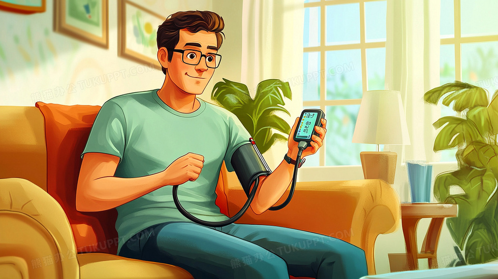 本作品内容为男子在家中测量血压卡通插画, 格式为 jpg, 大小3 MB, 图片尺寸为2912 x 1632, 源文件无水印, 欢迎使用熊猫办公。 如认为平台内容涉嫌侵权,可通过邮件:tousu@tukuppt.com提出书面通知,我们将及时处理。