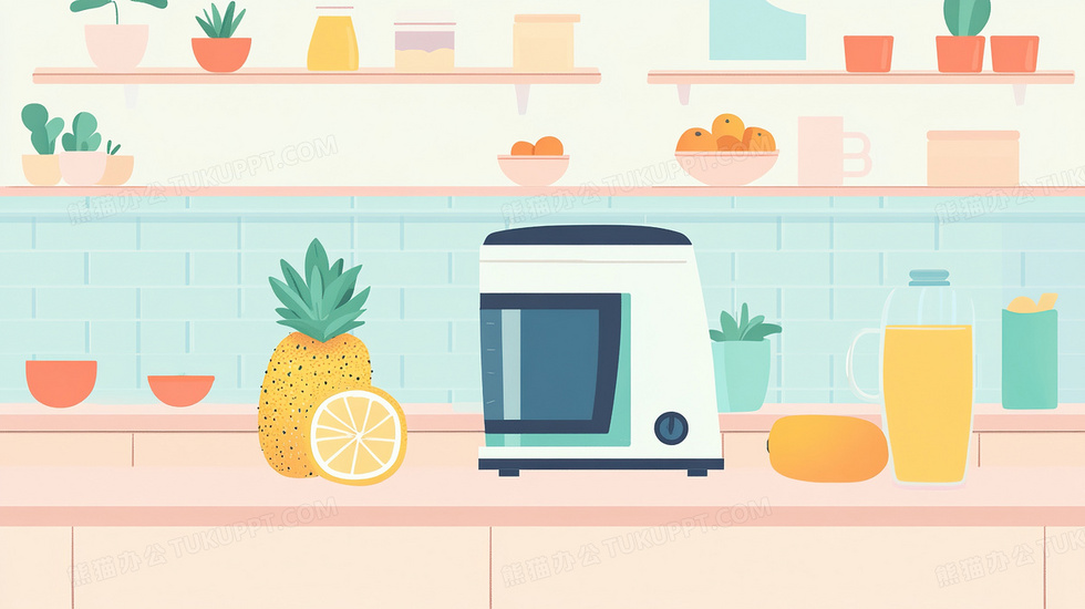 本作品内容为扁平风榨汁机旁的水果插画, 格式为 jpg, 大小2 MB, 图片尺寸为2912 x 1632, 源文件无水印, 欢迎使用熊猫办公。 如认为平台内容涉嫌侵权,可通过邮件:tousu@tukuppt.com提出书面通知,我们将及时处理。