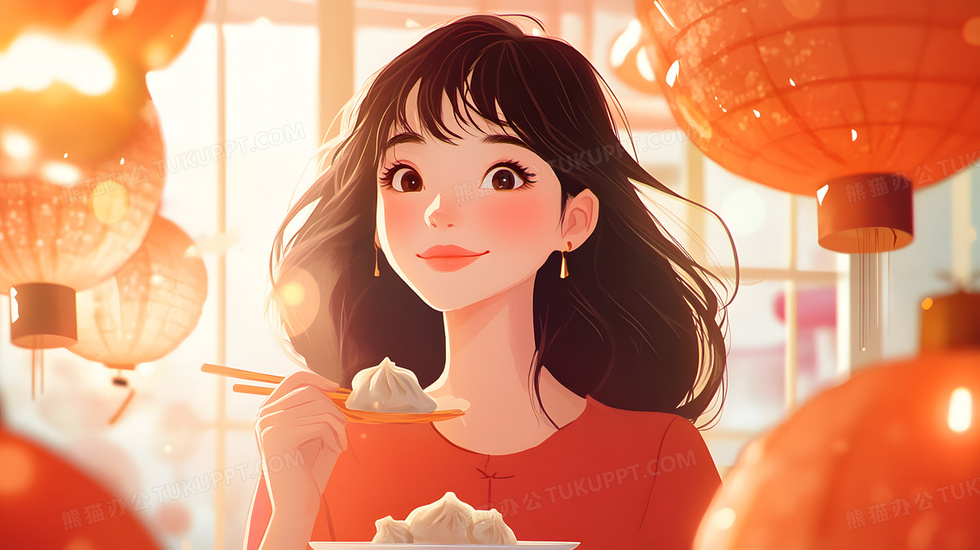 本作品内容为节日吃饺子的女孩插画, 格式为 jpg, 大小5 MB, 图片尺寸为2912 x 1632, 源文件无水印, 欢迎使用熊猫办公。 如认为平台内容涉嫌侵权,可通过邮件:tousu@tukuppt.com提出书面通知,我们将及时处理。