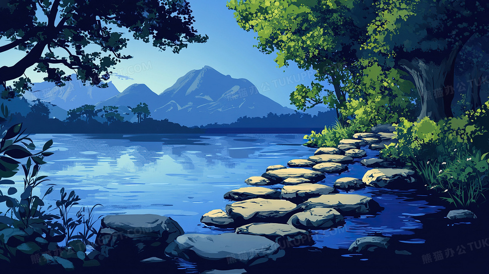 本作品内容为卡通风水面上的石头小路插画, 格式为 jpg, 大小4 MB, 图片尺寸为2912 x 1632, 源文件无水印, 欢迎使用熊猫办公。 如认为平台内容涉嫌侵权,可通过邮件:tousu@tukuppt.com提出书面通知,我们将及时处理。