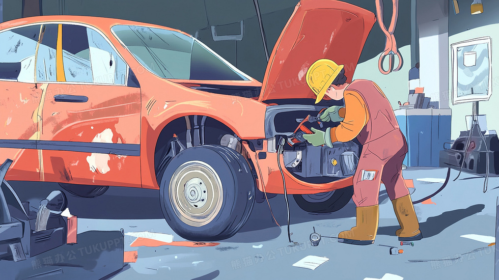 本作品内容为汽修厂汽修工人师傅维修汽车插画, 格式为 jpg, 大小3 MB, 图片尺寸为2912 x 1632, 源文件无水印, 欢迎使用熊猫办公。 如认为平台内容涉嫌侵权,可通过邮件:tousu@tukuppt.com提出书面通知,我们将及时处理。