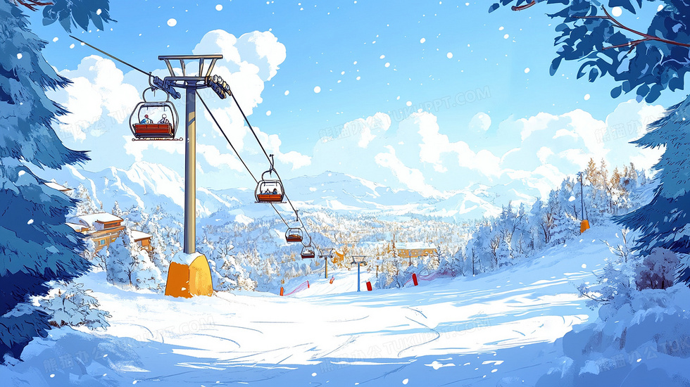 本作品内容为冬季旅游景点滑雪场缆车插画, 格式为 jpg, 大小3 MB, 图片尺寸为2912 x 1632, 源文件无水印, 欢迎使用熊猫办公。 如认为平台内容涉嫌侵权,可通过邮件:tousu@tukuppt.com提出书面通知,我们将及时处理。