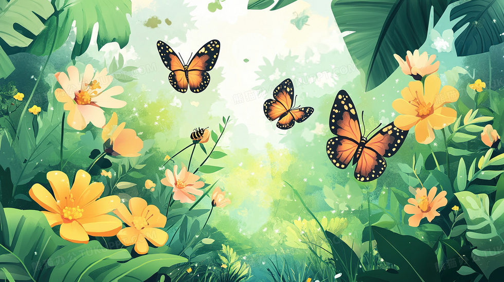 首页 > 插画 > 科技艺术 > 卡通漫画 > 花丛蜜蜂大自然蝴蝶植物昆虫插画