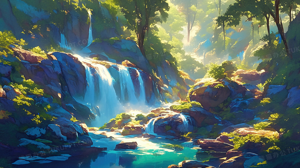 本作品内容为绿色森林中的瀑布插画, 格式为 jpg, 大小3 MB, 图片尺寸为2912 x 1632, 源文件无水印, 欢迎使用熊猫办公。 如认为平台内容涉嫌侵权,可通过邮件:tousu@tukuppt.com提出书面通知,我们将及时处理。