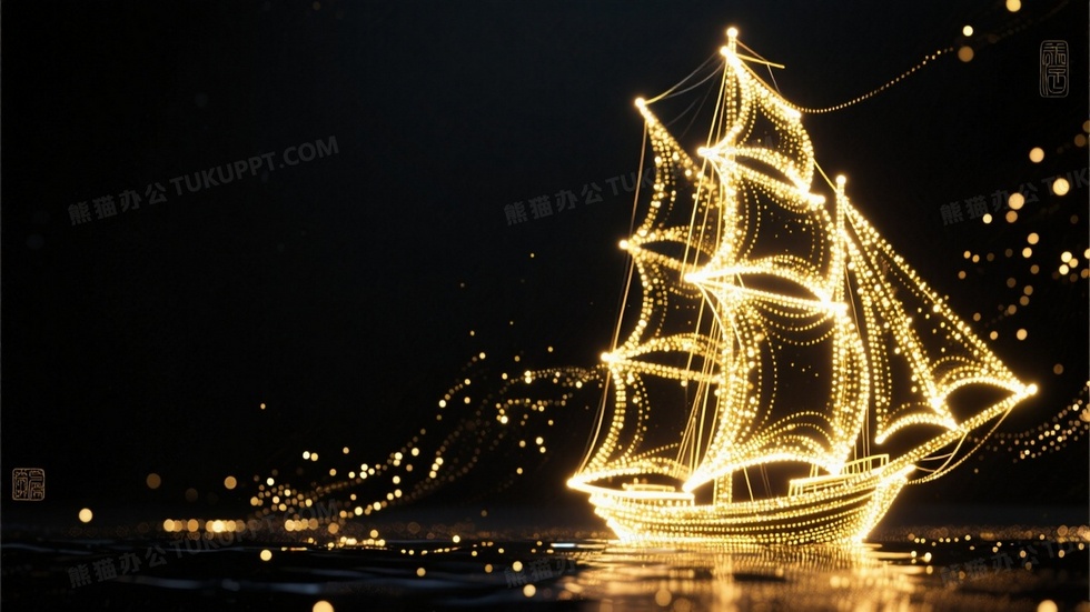 本作品内容为画面右侧是由发光流动粒子组成的金色帆船, 格式为 jpg, 大小1 MB, 图片尺寸为1664 x 936, 作品中背景图片无需修改, 源文件无水印,可以直接使用, 欢迎使用熊猫办公。 如认为平台内容涉嫌侵权,可通过邮件:tousu@tukuppt.com提出书面通知,我们将及时处理。
