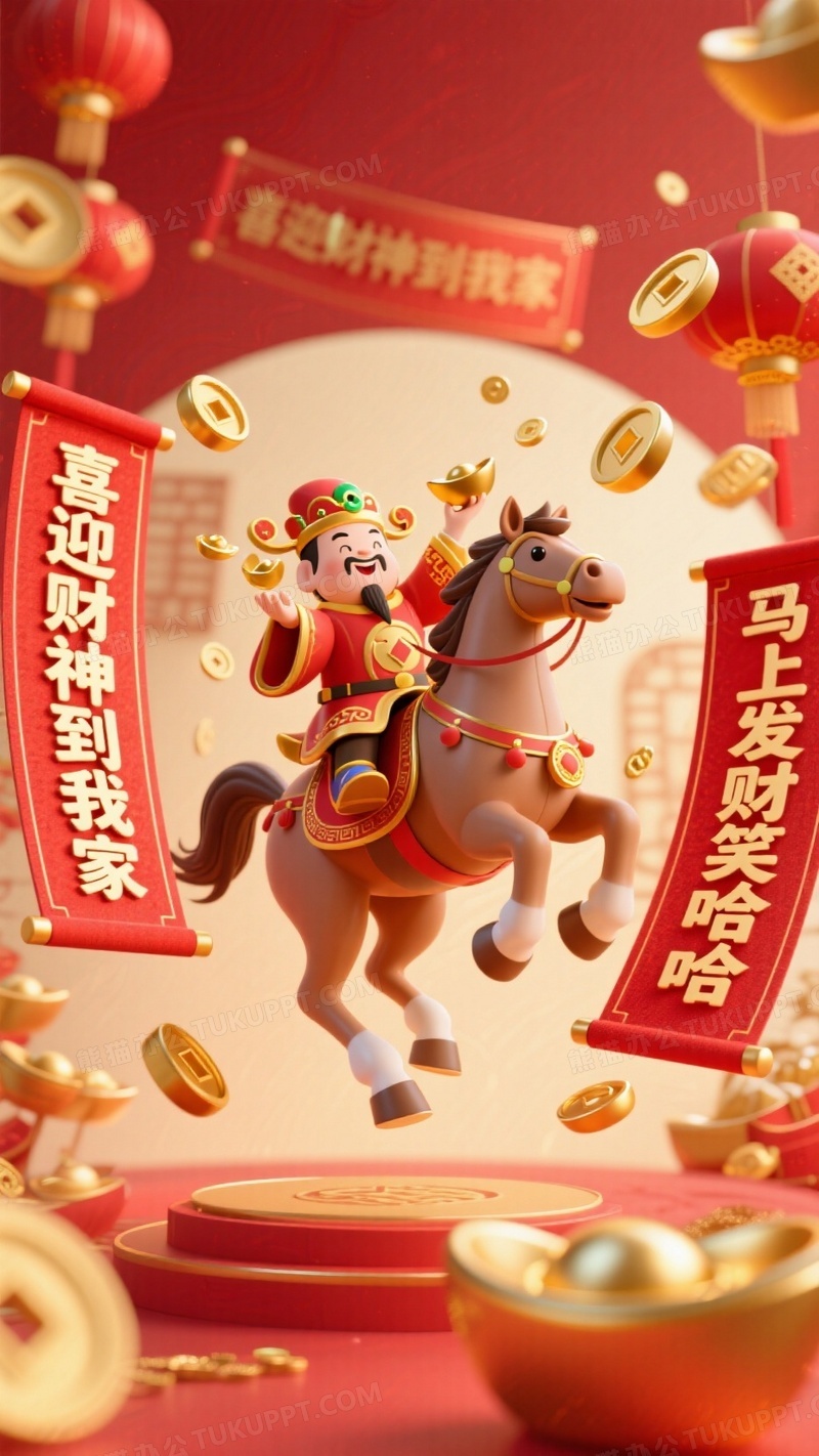 本作品内容为春节主题插画财神骑马撒金元宝, 格式为 jpg, 大小1 MB, 图片尺寸为936 x 1664, 源文件无水印, 欢迎使用熊猫办公。 如认为平台内容涉嫌侵权,可通过邮件:tousu@tukuppt.com提出书面通知,我们将及时处理。