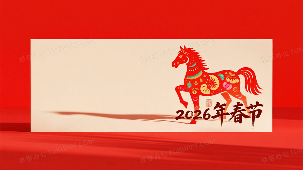 本作品内容为马年春节红色剪纸马简约背景图, 格式为 jpg, 大小5 MB, 图片尺寸为3328 x 1872, 作品中背景图片无需修改, 源文件无水印,可以直接使用, 欢迎使用熊猫办公。 如认为平台内容涉嫌侵权,可通过邮件:tousu@tukuppt.com提出书面通知,我们将及时处理。
