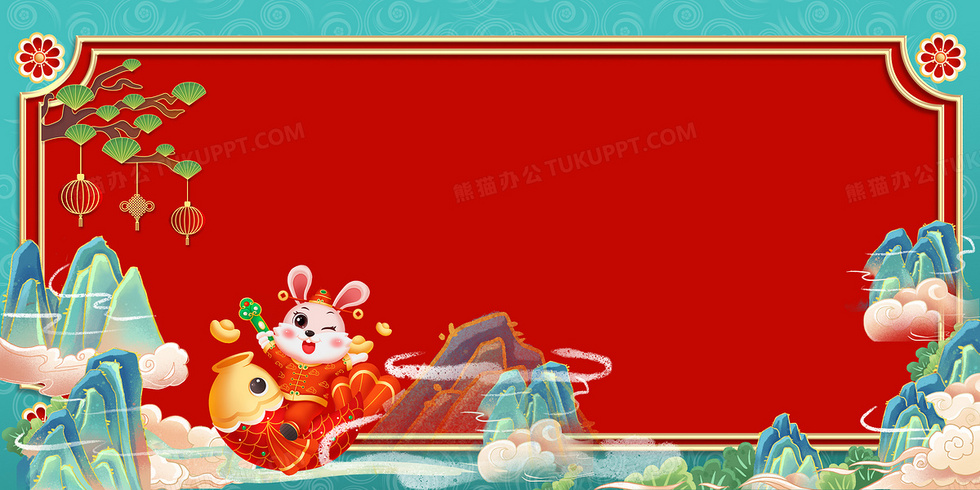 本作品内容为中国风兔年边框背景, 格式为 psd, 大小40 MB, 图片尺寸为4724 x 2362, 作品中背景图片无需修改, 源文件无水印,可以直接使用, 欢迎使用熊猫办公。 如认为平台内容涉嫌侵权,可通过邮件:tousu@tukuppt.com提出书面通知,我们将及时处理。
