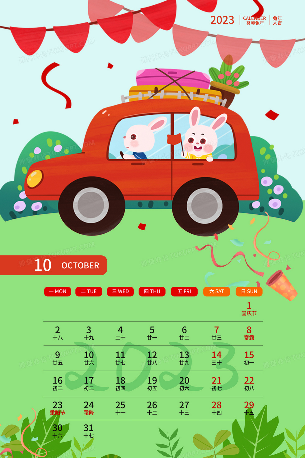 本作品内容为兔年2023可爱10月卡通海报日历, 格式为 psd, 大小21 MB, 图片尺寸为2362 x 3543, 作品中背景图片无需修改, 源文件无水印,可以直接使用, 欢迎使用熊猫办公。 如认为平台内容涉嫌侵权,可通过邮件:tousu@tukuppt.com提出书面通知,我们将及时处理。