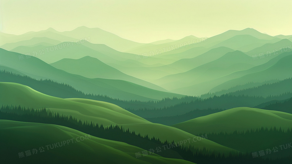 本作品内容为绿色起伏远山山脉风景背景, 格式为 jpg, 大小2 MB, 图片尺寸为2912 x 1632, 作品中背景图片无需修改, 源文件无水印,可以直接使用, 欢迎使用熊猫办公。 如认为平台内容涉嫌侵权,可通过邮件:tousu@tukuppt.com提出书面通知,我们将及时处理。
