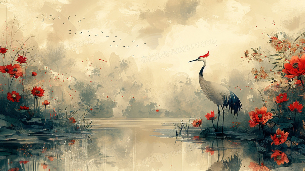 本作品内容为中国风湖边丹顶鹤插画, 格式为 jpg, 大小2 MB, 图片尺寸为2240 x 1256, 源文件无水印, 欢迎使用熊猫办公。 如认为平台内容涉嫌侵权,可通过邮件:tousu@tukuppt.com提出书面通知,我们将及时处理。