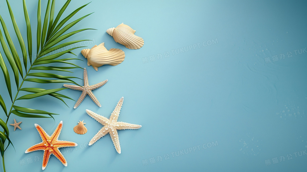 本作品内容为夏季蓝色海星棕榈叶装饰背景, 格式为 jpg, 大小3 MB, 图片尺寸为2912 x 1632, 作品中背景图片无需修改, 源文件无水印,可以直接使用, 欢迎使用熊猫办公。 如认为平台内容涉嫌侵权,可通过邮件:tousu@tukuppt.com提出书面通知,我们将及时处理。