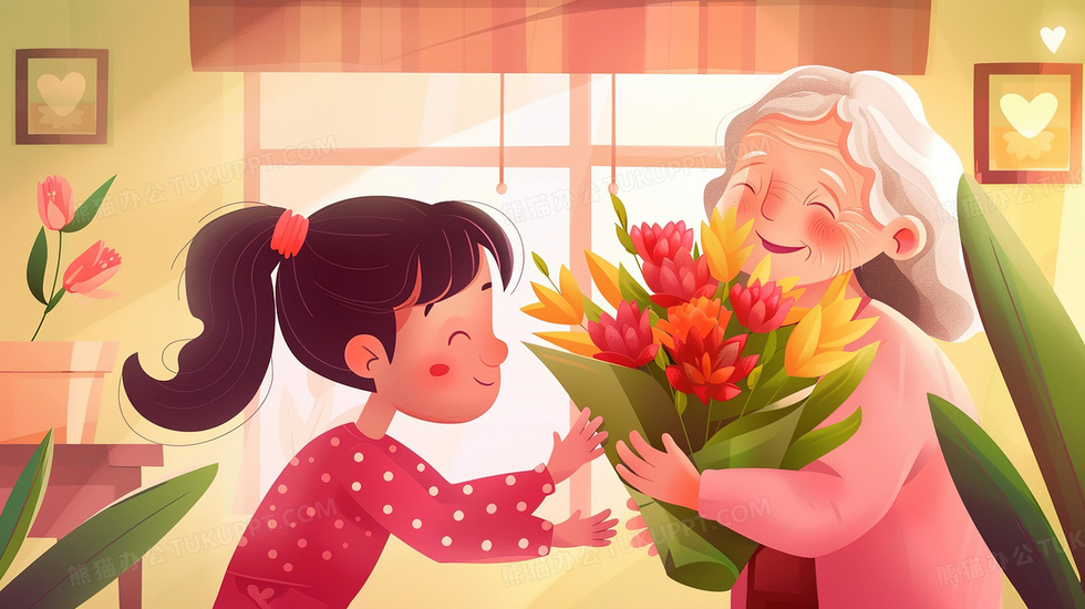 本作品内容为给姥姥鲜花的小女孩插画, 格式为 jpg, 大小3 MB, 图片尺寸为2912 x 1632, 源文件无水印, 欢迎使用熊猫办公。 如认为平台内容涉嫌侵权,可通过邮件:tousu@tukuppt.com提出书面通知,我们将及时处理。
