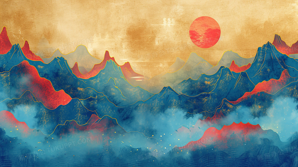 本作品内容为唯美彩色国潮鎏金山水画插画, 格式为 jpg, 大小5 MB, 图片尺寸为2912 x 1632, 源文件无水印, 欢迎使用熊猫办公。 如认为平台内容涉嫌侵权,可通过邮件:tousu@tukuppt.com提出书面通知,我们将及时处理。