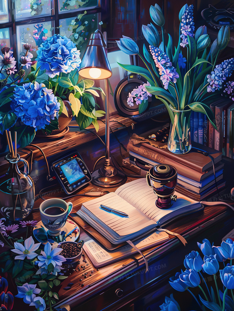 本作品内容为书房书桌上摆放的打开的书本与音乐播放器插画, 格式为 jpg, 大小4 MB, 图片尺寸为1856 x 2464, 源文件无水印, 欢迎使用熊猫办公。 如认为平台内容涉嫌侵权,可通过邮件:tousu@tukuppt.com提出书面通知,我们将及时处理。