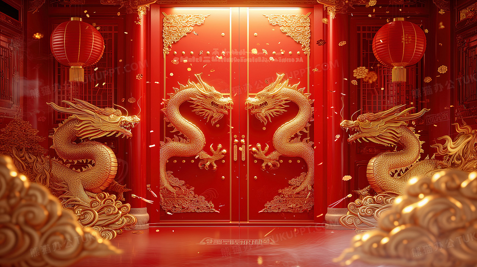 本作品内容为精致神龙装饰的红色大门古风场景图, 格式为 jpg, 大小12 MB, 图片尺寸为5824 x 3264, 源文件无水印, 欢迎使用熊猫办公。 如认为平台内容涉嫌侵权,可通过邮件:tousu@tukuppt.com提出书面通知,我们将及时处理。