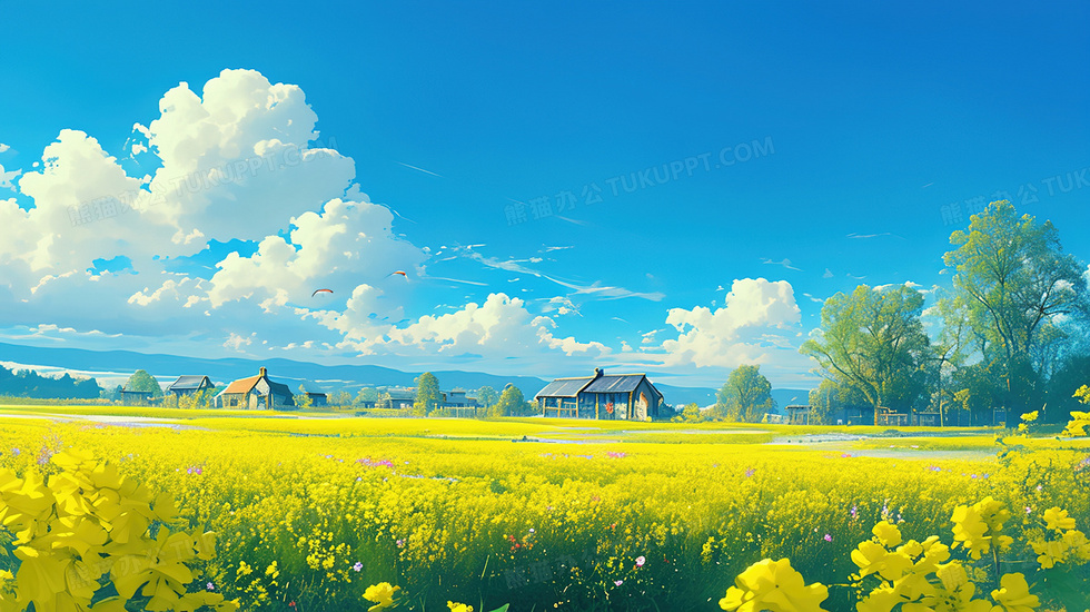 本作品内容为唯美清新春天油菜花田插画, 格式为 jpg, 大小4 MB, 图片尺寸为2912 x 1632, 源文件无水印, 欢迎使用熊猫办公。 如认为平台内容涉嫌侵权,可通过邮件:tousu@tukuppt.com提出书面通知,我们将及时处理。