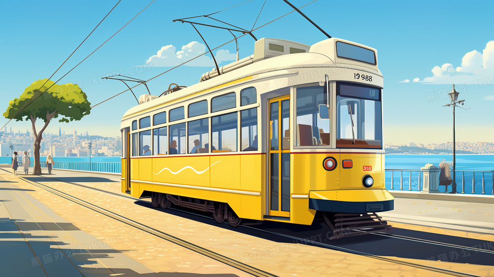 本作品内容为夏日海边行驶的黄色有轨电车插画, 格式为 jpg, 大小3 MB, 图片尺寸为2912 x 1632, 源文件无水印, 欢迎使用熊猫办公。 如认为平台内容涉嫌侵权,可通过邮件:tousu@tukuppt.com提出书面通知,我们将及时处理。
