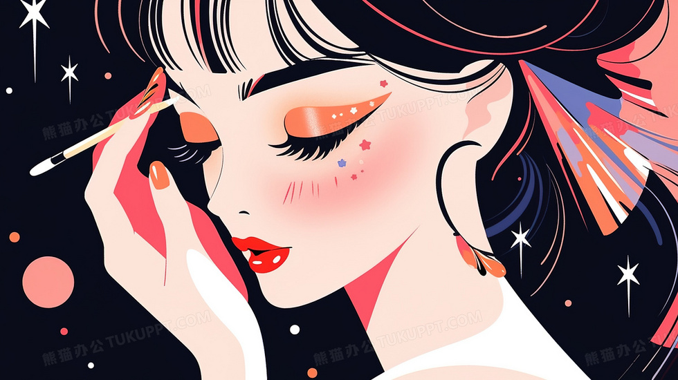 本作品内容为一个妆容精致的女孩插画, 格式为 jpg, 大小2 MB, 图片尺寸为2912 x 1632, 源文件无水印, 欢迎使用熊猫办公。 如认为平台内容涉嫌侵权,可通过邮件:tousu@tukuppt.com提出书面通知,我们将及时处理。