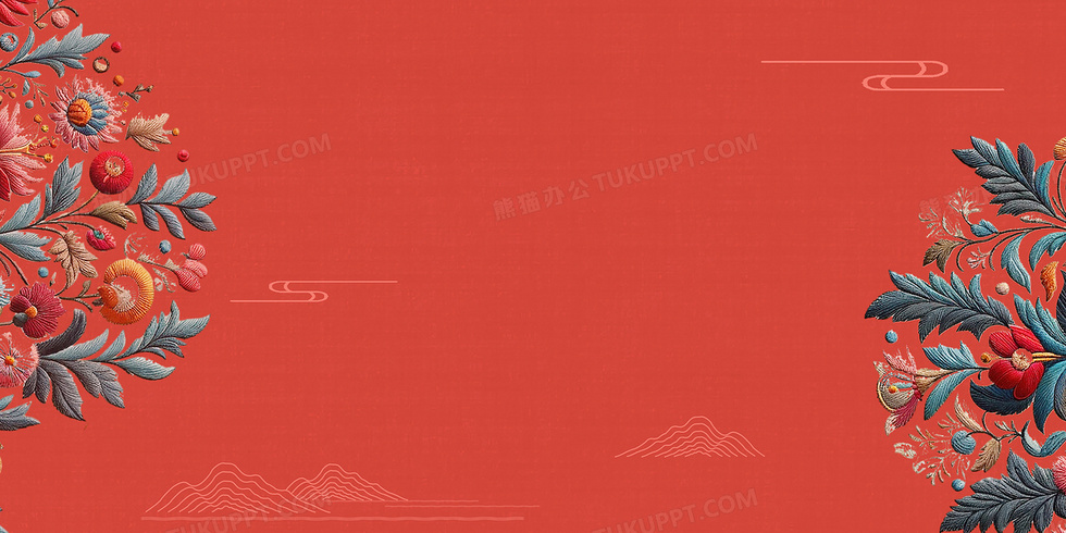 本作品内容为红色中国风刺绣纹理背景, 格式为 psd, 大小100 MB, 图片尺寸为4724 x 2362, 作品中背景图片无需修改, 源文件无水印,可以直接使用, 欢迎使用熊猫办公。 如认为平台内容涉嫌侵权,可通过邮件:tousu@tukuppt.com提出书面通知,我们将及时处理。