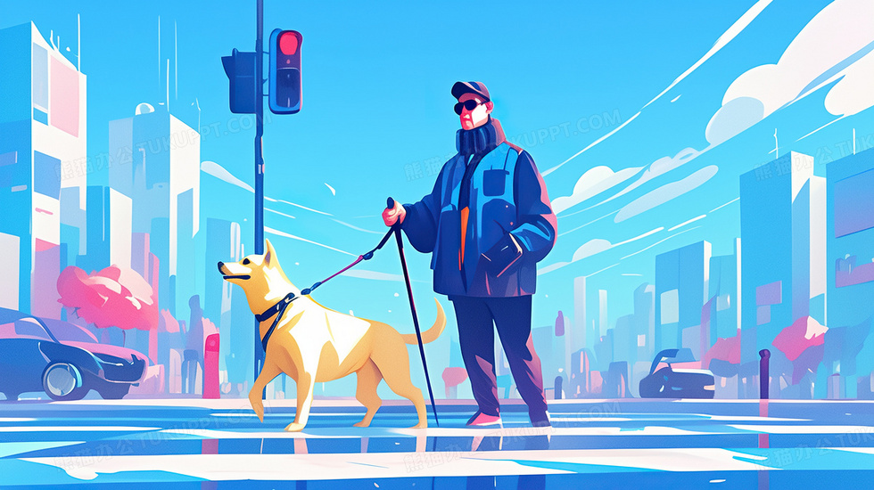 本作品内容为盲人牵着导盲犬过马路插画, 格式为 jpg, 大小3 MB, 图片尺寸为2912 x 1632, 源文件无水印, 欢迎使用熊猫办公。 如认为平台内容涉嫌侵权,可通过邮件:tousu@tukuppt.com提出书面通知,我们将及时处理。
