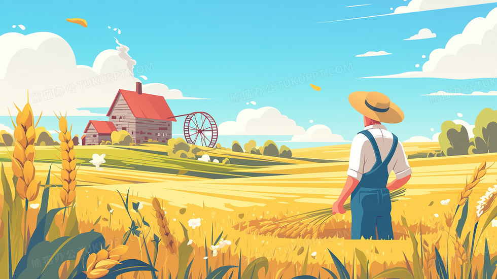 本作品内容为农民麦田田地劳作收割麦穗插画, 格式为 jpg, 大小3 MB, 图片尺寸为2912 x 1632, 源文件无水印, 欢迎使用熊猫办公。 如认为平台内容涉嫌侵权,可通过邮件:tousu@tukuppt.com提出书面通知,我们将及时处理。