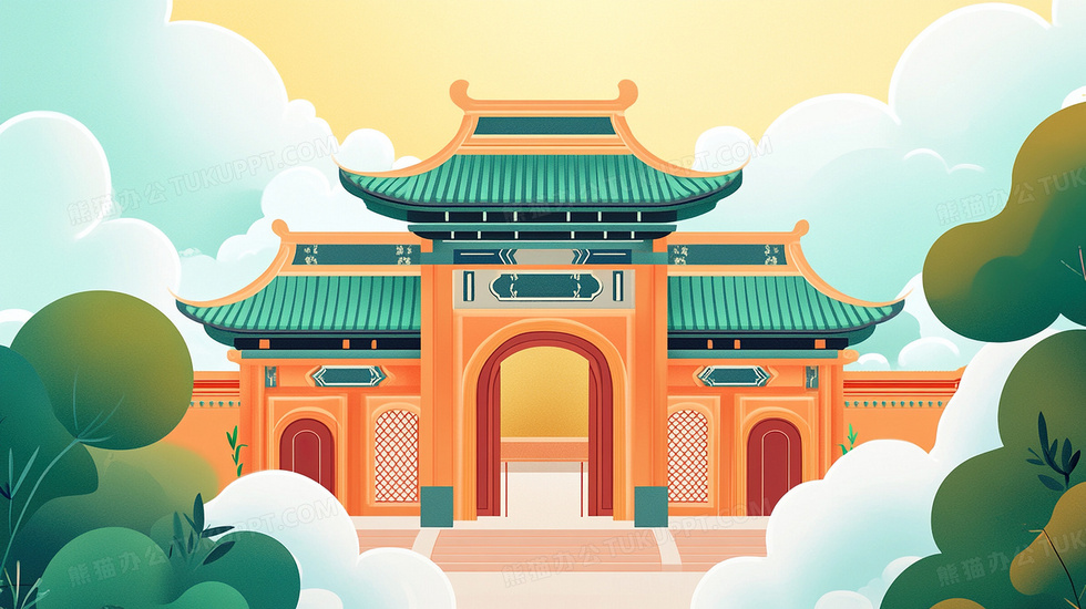 本作品内容为国潮中国风中式美学门楼建筑插画, 格式为 jpg, 大小3 MB, 图片尺寸为2912 x 1632, 源文件无水印, 欢迎使用熊猫办公。 如认为平台内容涉嫌侵权,可通过邮件:tousu@tukuppt.com提出书面通知,我们将及时处理。