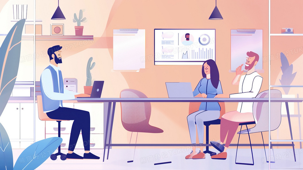 本作品内容为企业商务办公开会的员工插画, 格式为 jpg, 大小2 MB, 图片尺寸为2912 x 1632, 源文件无水印, 欢迎使用熊猫办公。 如认为平台内容涉嫌侵权,可通过邮件:tousu@tukuppt.com提出书面通知,我们将及时处理。