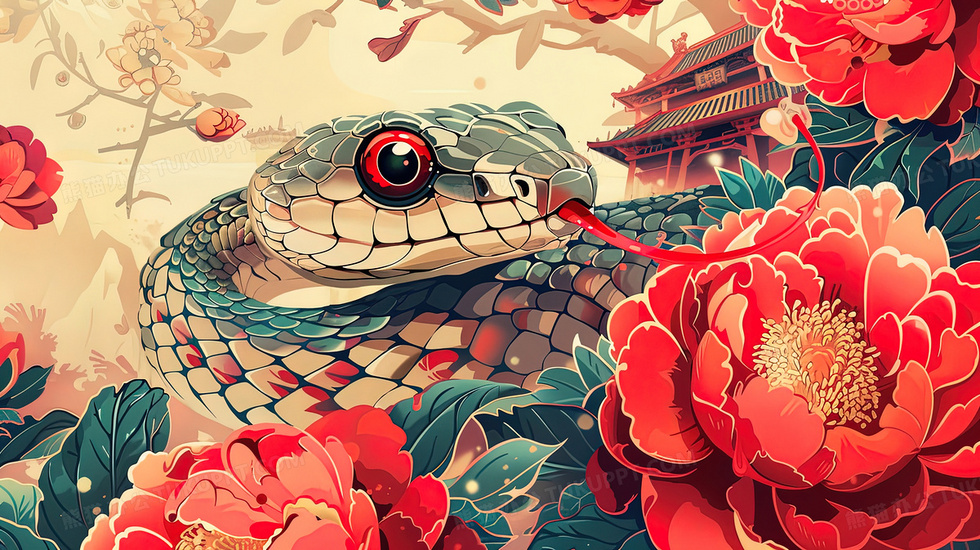 气势磅礴水墨蛇年中式建筑花卉插画
