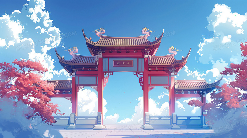 本作品内容为中国古建筑牌坊插画, 格式为 jpg, 大小3 MB, 图片尺寸为2912 x 1632, 源文件无水印, 欢迎使用熊猫办公。 如认为平台内容涉嫌侵权,可通过邮件:tousu@tukuppt.com提出书面通知,我们将及时处理。
