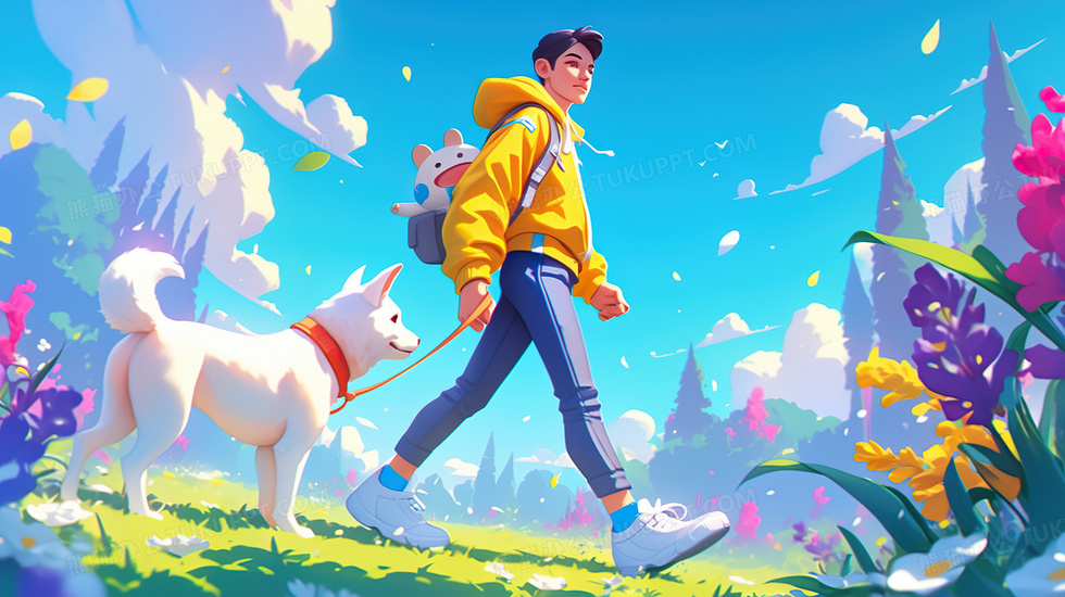 本作品内容为男孩在草地上遛狗插画, 格式为 jpg, 大小3 MB, 图片尺寸为2912 x 1632, 源文件无水印, 欢迎使用熊猫办公。 如认为平台内容涉嫌侵权,可通过邮件:tousu@tukuppt.com提出书面通知,我们将及时处理。