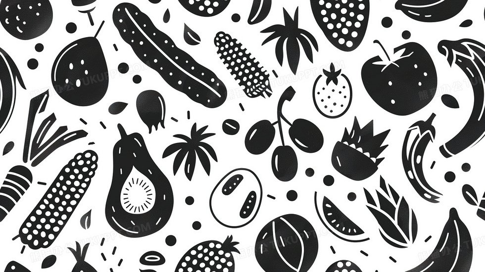 本作品内容为黑白蔬菜水果底纹背景, 格式为 jpg, 大小3 MB, 图片尺寸为2912 x 1632, 作品中背景图片无需修改, 源文件无水印,可以直接使用, 欢迎使用熊猫办公。 如认为平台内容涉嫌侵权,可通过邮件:tousu@tukuppt.com提出书面通知,我们将及时处理。