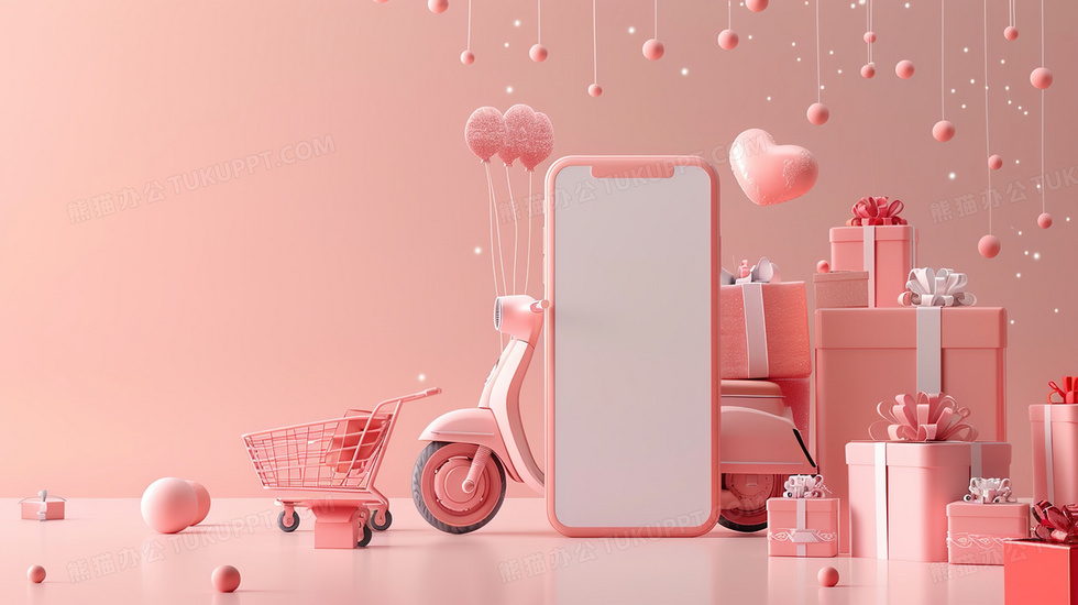 本作品内容为3D风格网上购物粉色背景, 格式为 jpg, 大小4 MB, 图片尺寸为2912 x 1632, 作品中背景图片无需修改, 源文件无水印,可以直接使用, 欢迎使用熊猫办公。 如认为平台内容涉嫌侵权,可通过邮件:tousu@tukuppt.com提出书面通知,我们将及时处理。