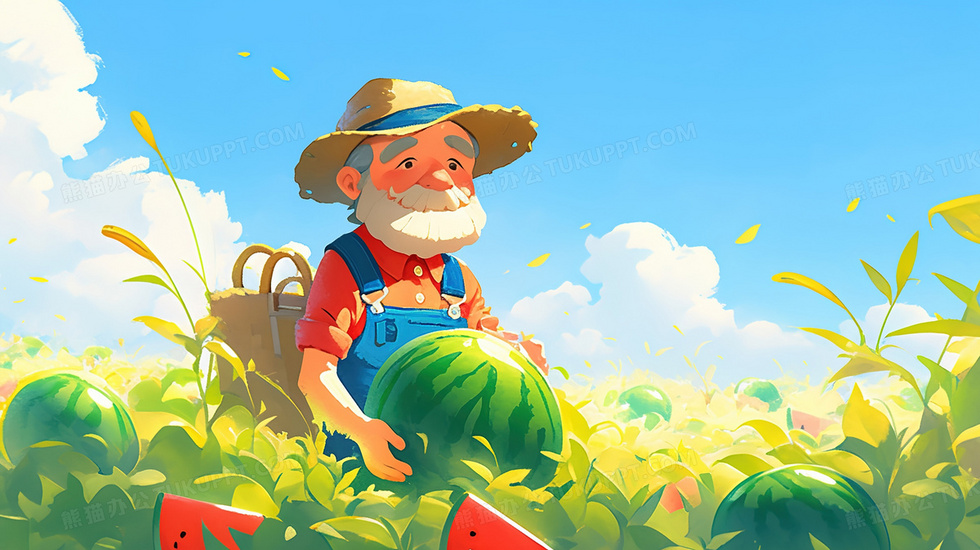 本作品内容为夏季农田丰收西瓜的农民老人插画, 格式为 jpg, 大小2 MB, 图片尺寸为2912 x 1632, 源文件无水印, 欢迎使用熊猫办公。 如认为平台内容涉嫌侵权,可通过邮件:tousu@tukuppt.com提出书面通知,我们将及时处理。