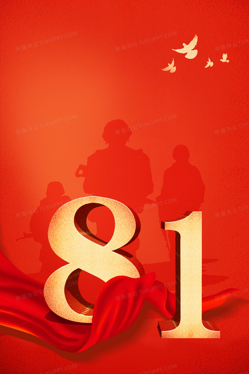 本作品内容为八一建军节军人剪影红色丝绸红金党政党建背景, 格式为 psd, 大小141 MB, 图片尺寸为3543 x 5315, 作品中背景图片无需修改, 源文件无水印,可以直接使用, 欢迎使用熊猫办公。 如认为平台内容涉嫌侵权,可通过邮件:tousu@tukuppt.com提出书面通知,我们将及时处理。