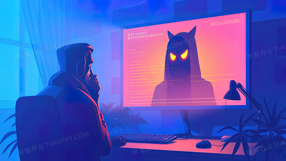 本作品内容为电子网络安全电信诈骗黑客插画, 格式为 jpg, 大小2 MB, 图片尺寸为2912 x 1632, 源文件无水印, 欢迎使用熊猫办公。 如认为平台内容涉嫌侵权,可通过邮件:tousu@tukuppt.com提出书面通知,我们将及时处理。