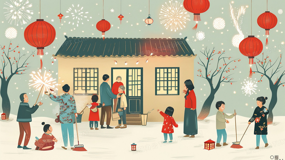 本作品内容为过年大扫除放烟花挂灯笼的一家人插画, 格式为 jpg, 大小3 MB, 图片尺寸为2912 x 1632, 源文件无水印, 欢迎使用熊猫办公。 如认为平台内容涉嫌侵权,可通过邮件:tousu@tukuppt.com提出书面通知,我们将及时处理。