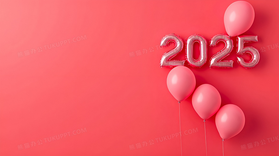 本作品内容为红色简约数字2025与一串粉色气球合成背景, 格式为 jpg, 大小2 MB, 图片尺寸为2912 x 1632, 作品中背景图片无需修改, 源文件无水印,可以直接使用, 欢迎使用熊猫办公。 如认为平台内容涉嫌侵权,可通过邮件:tousu@tukuppt.com提出书面通知,我们将及时处理。
